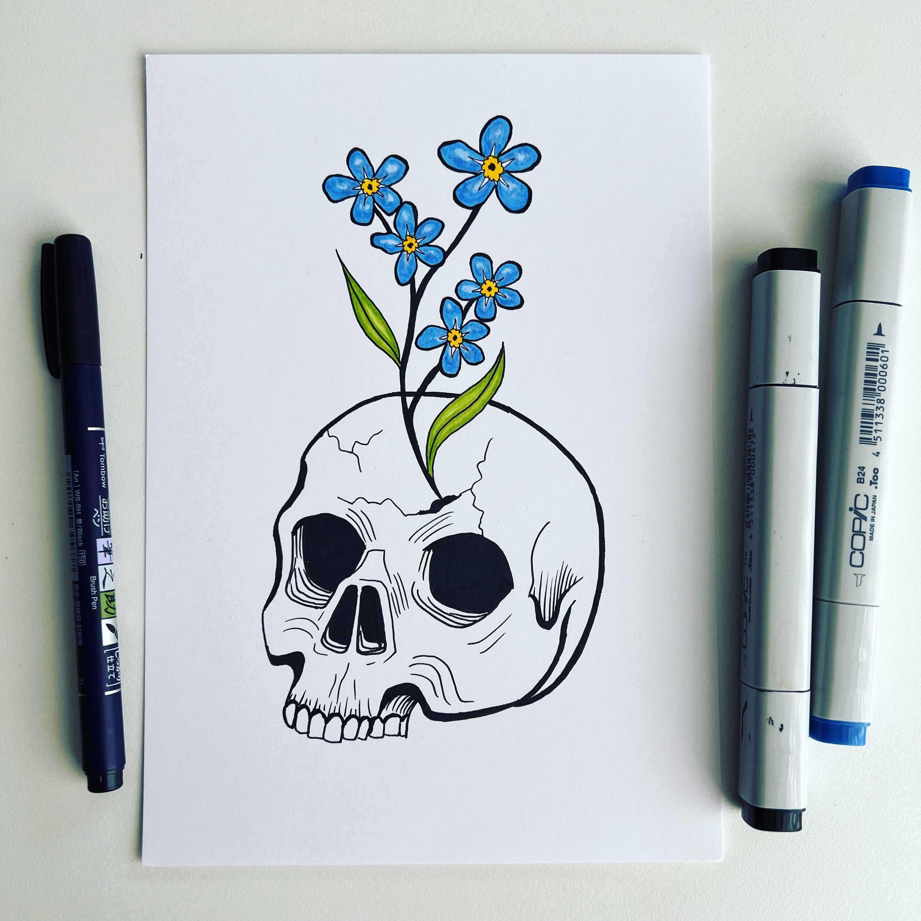 Forget Me Not Skull Original Ink Drawing Inktober 2022 Etsy